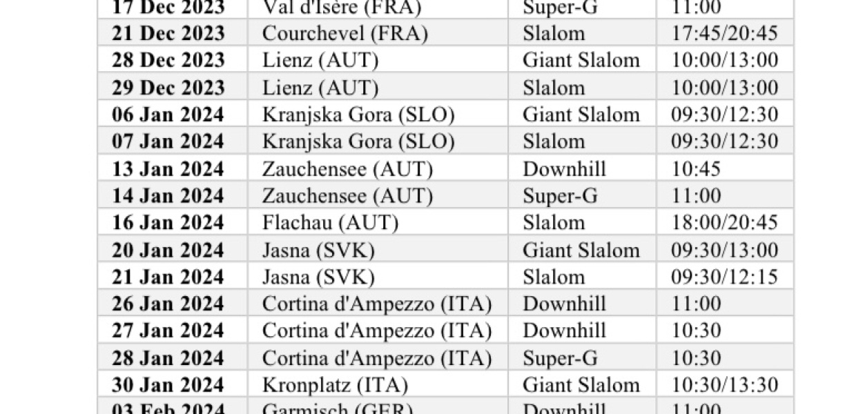 ?php>Pełny kalendarz Pucharu Świata kobiet w narciarstwie alpejskim 2023/2024