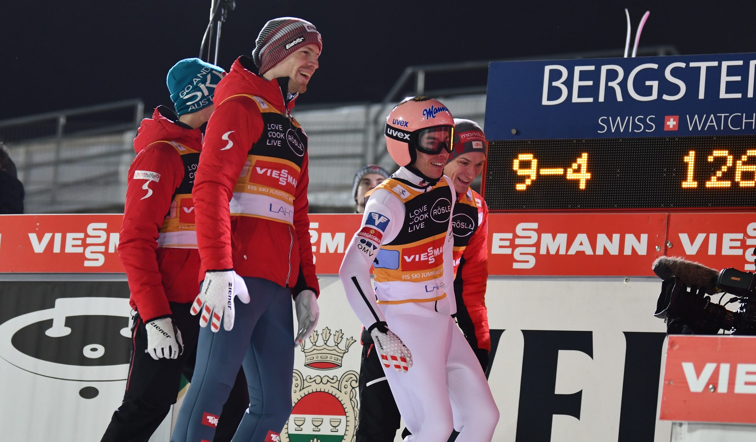 Warunki na skoczni dziś były trudne. Wiatr wiał często z tyłu skoczni, zawodnikami kręciło. Niektórzy mieli więcej szczęścia, niektórzy mniej. Mimo wszystko nie można mówić o wypaczonych wynikach. Słoweńcy prowadzili po pierwszej serii, ale przewaga nad Austriakami nie była duża. W drugiej serii wyraźnie lepsi byli mistrzowie z Turynu i Vancouver i wyrwali Słoweńcom zwycięstwo. Austria z notą 942,7 pkt (dość niską jak na drużynówkę) pokonała Słowenię o 8,3 pkt. Austriacy wystąpili w składzie: Stefan Kraft, Daniel Huber, Jan Hoerl, Manuel Fettner. Tym samym Kraft wreszcie doczekał się medalu olimpijskiego. W drużynie Słowenii skakali kolejno Lovro Kos, Cene Prevc, Timi Zajc i Peter Prevc.
